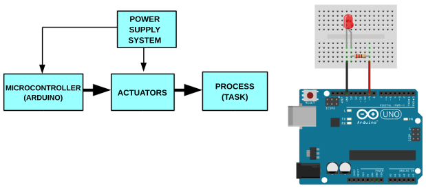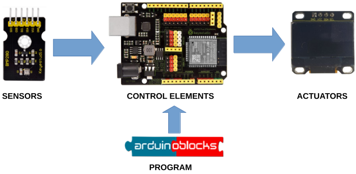 - Output elements: these will be the actuators, which our programme will decide to start and stop, such as: LEDs, buzzers, motors, screens, etc.