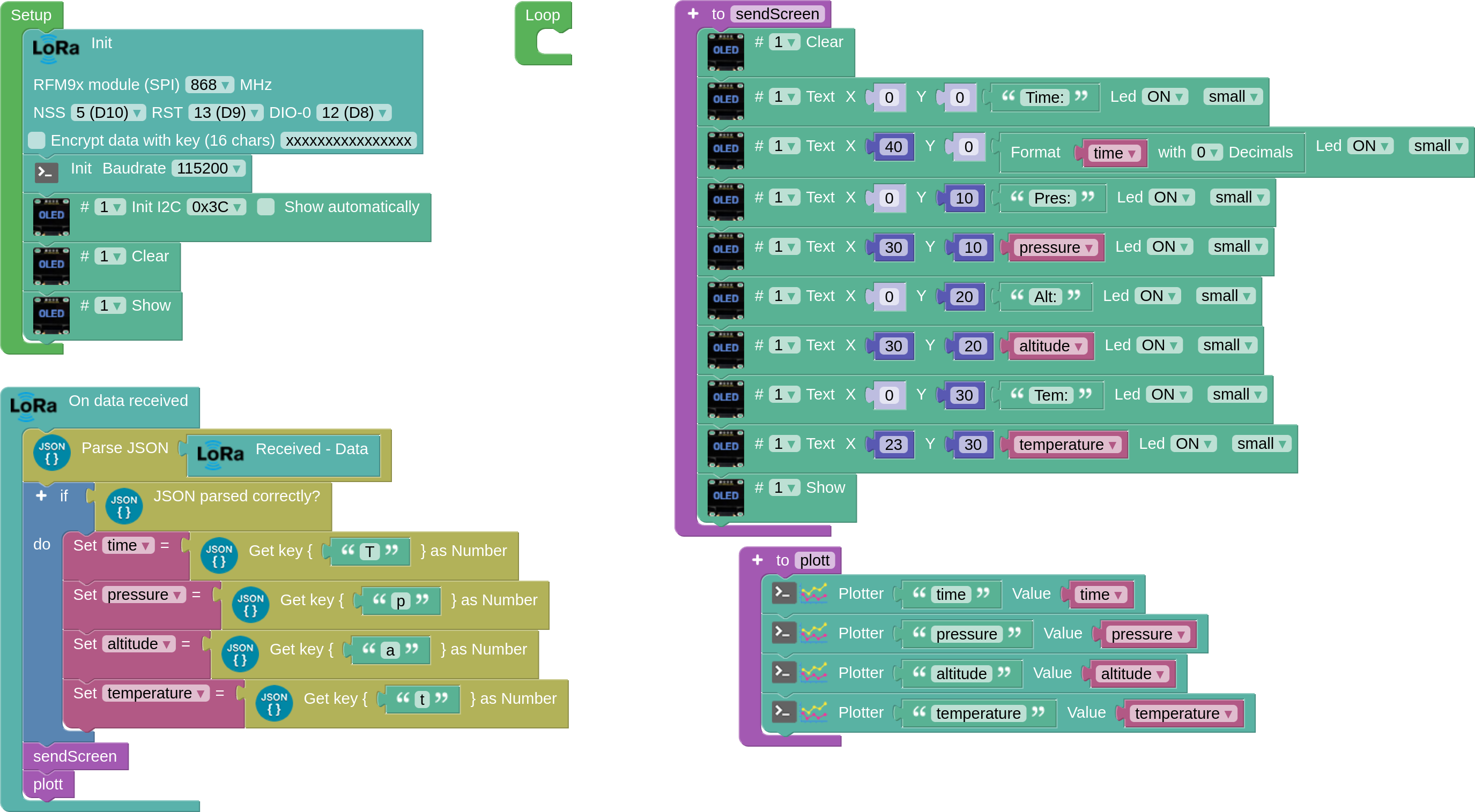 To process the data received from the receiver on the computer, we have previously sent the data (sender program) in JSON format via LoRa communication. To process it on the computer, we need to collect it on the board or receive it via LoRa in JSON format, analyse it and extract it by assigning it to variables that will be sent to the computer via the serial port (USB serial communication), plotted in real time and then saved in CSV format.