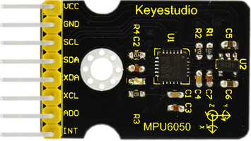 The MPU6050 sensor is an accelerometer and gyroscope that can provide acceleration and tilt in the three axes of space. It is connected via an I2C bus port to one of the 4 ports with male pins on the board. To know more about this sensor we can see its description in the Keyestudio wiki.