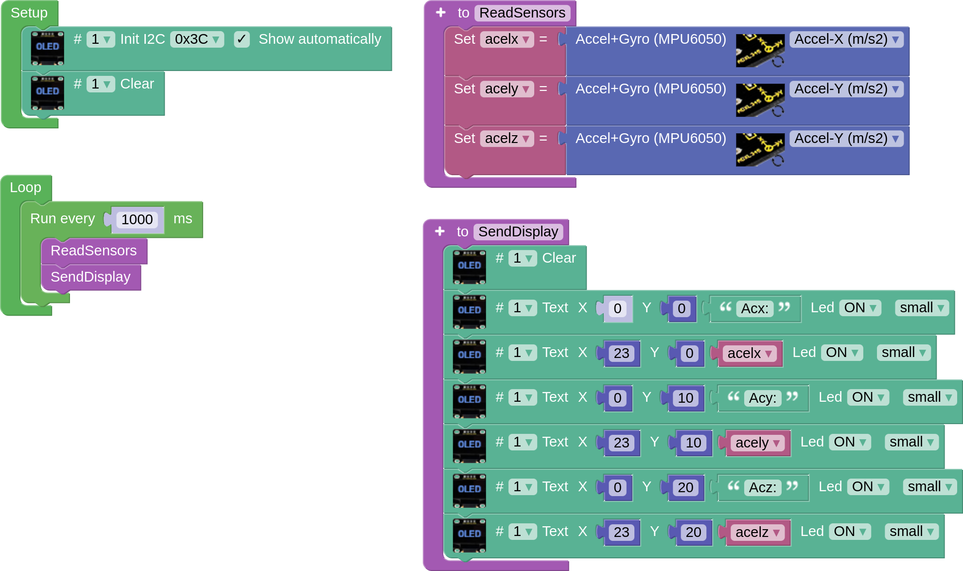 It correctly connects the OLED display to the MPU6050 sensor and displays the acceleration values in all three axes every second in a readable and orderly manner on the display.