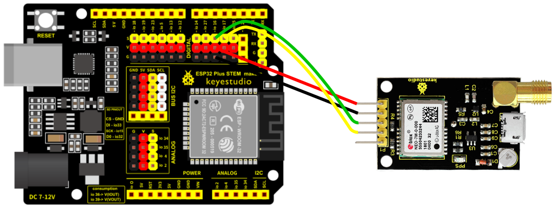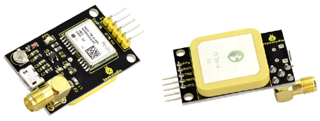 The GPS (Global Positioning System) is a device that allows us to determine our position on planet Earth by communicating with satellites. Specifically, we have the GPS6MV2 model, based on the UBLOX NEO 6M receiver chip. It communicates with the board via a serial port. To know more about this sensor we can see its description in the Keyestudio wiki.