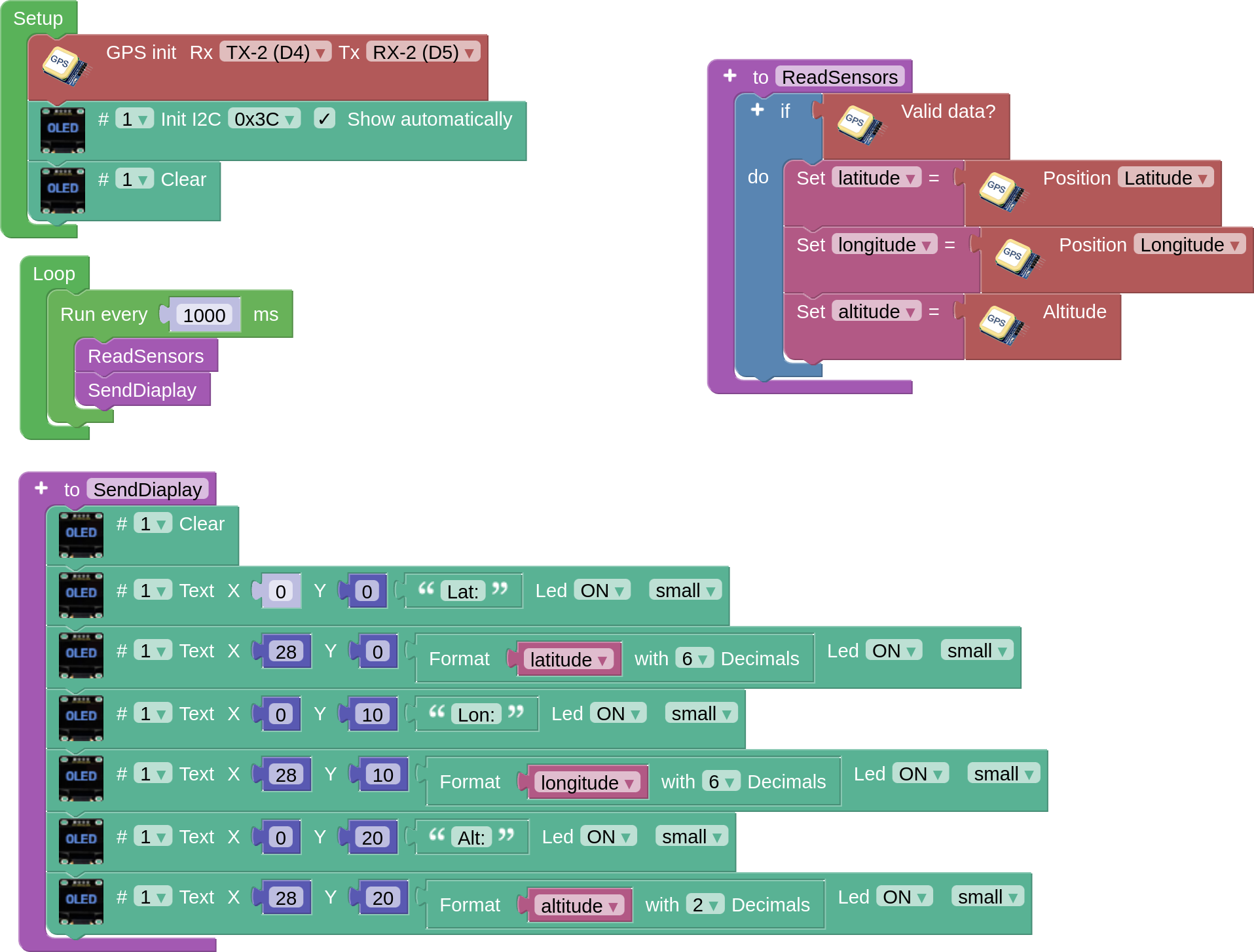 It correctly connects the OLED screen to the GPS and displays the values of latitude, longitude and altitude on the screen every second in a legible and ordered manner. Latitude and longitude with 6 decimal places and altitude with 2 decimal places. By default, the numerical variables, when displayed directly on the screen, offer only two decimal places.
