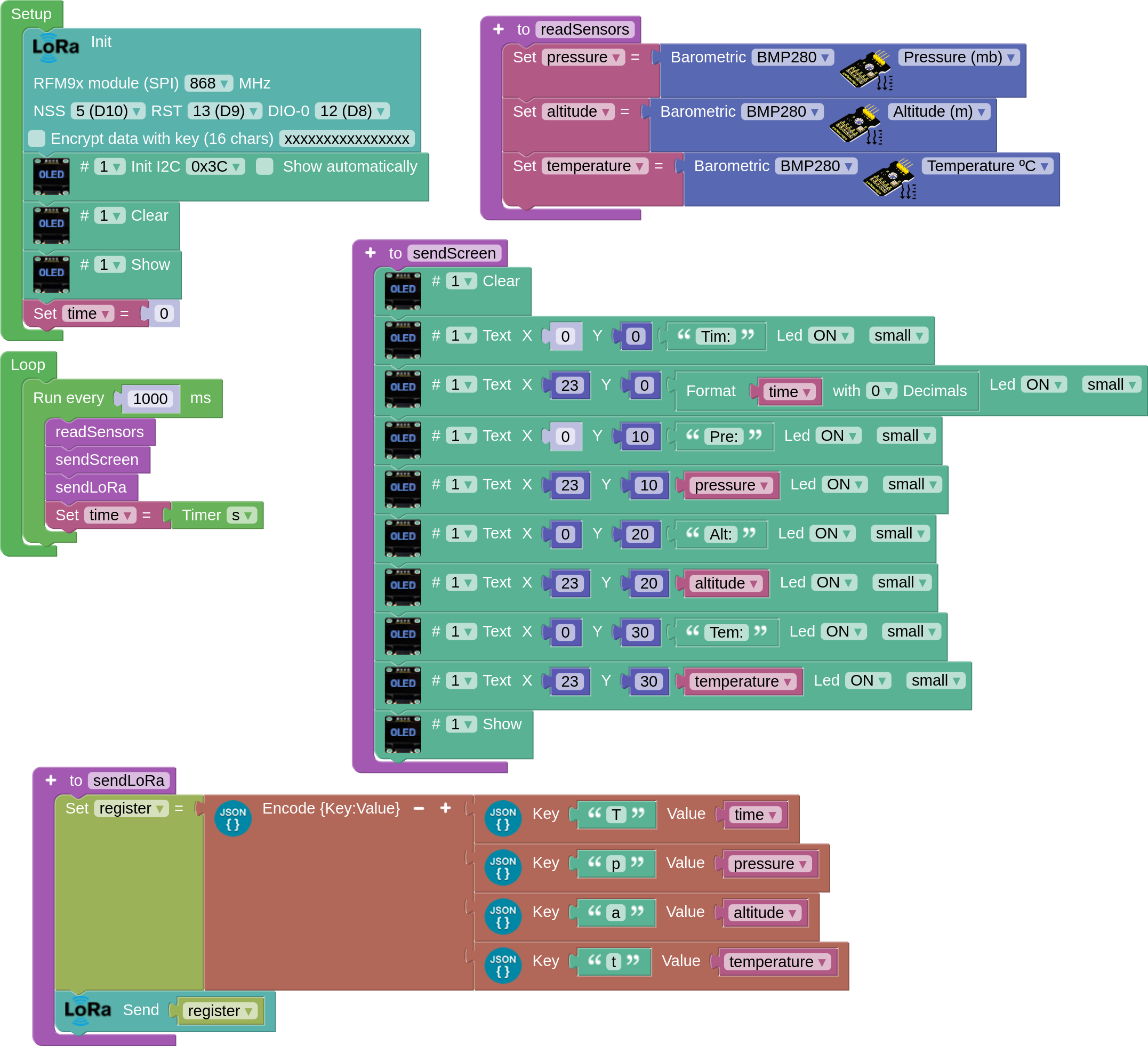 This program sends the time (s), pressure (mb), altitude (m) and temperature (ºC) information to a LoRa receiver every second via LoRa in JSON text format.