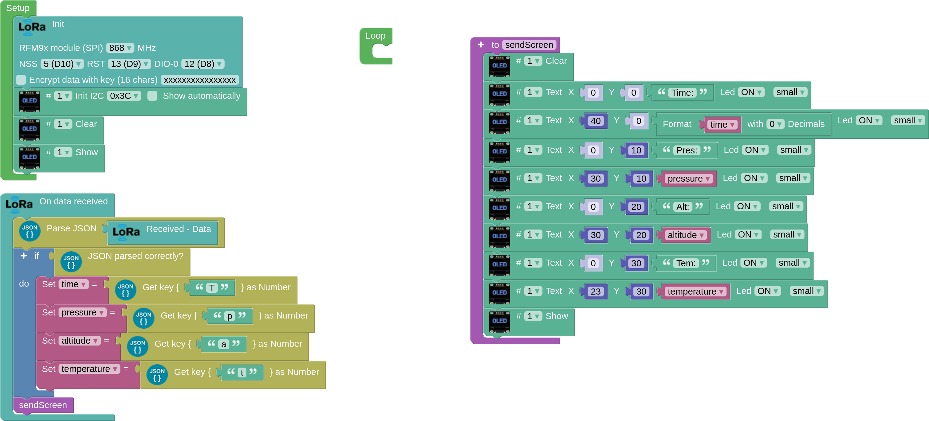 The following program receives the data via LoRa from the previous sender, parses the JSON data and, if it is correct, assigns it to variables and displays it on the OLED screen.