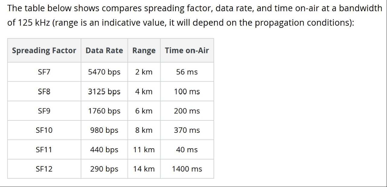 The lower the SF, the higher the data rate and the shorter the range; the higher the SF, the lower the data rate and the longer the range. The range is also highly dependent on the environment and any structures or obstacles in the way.