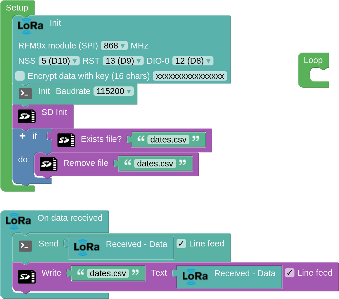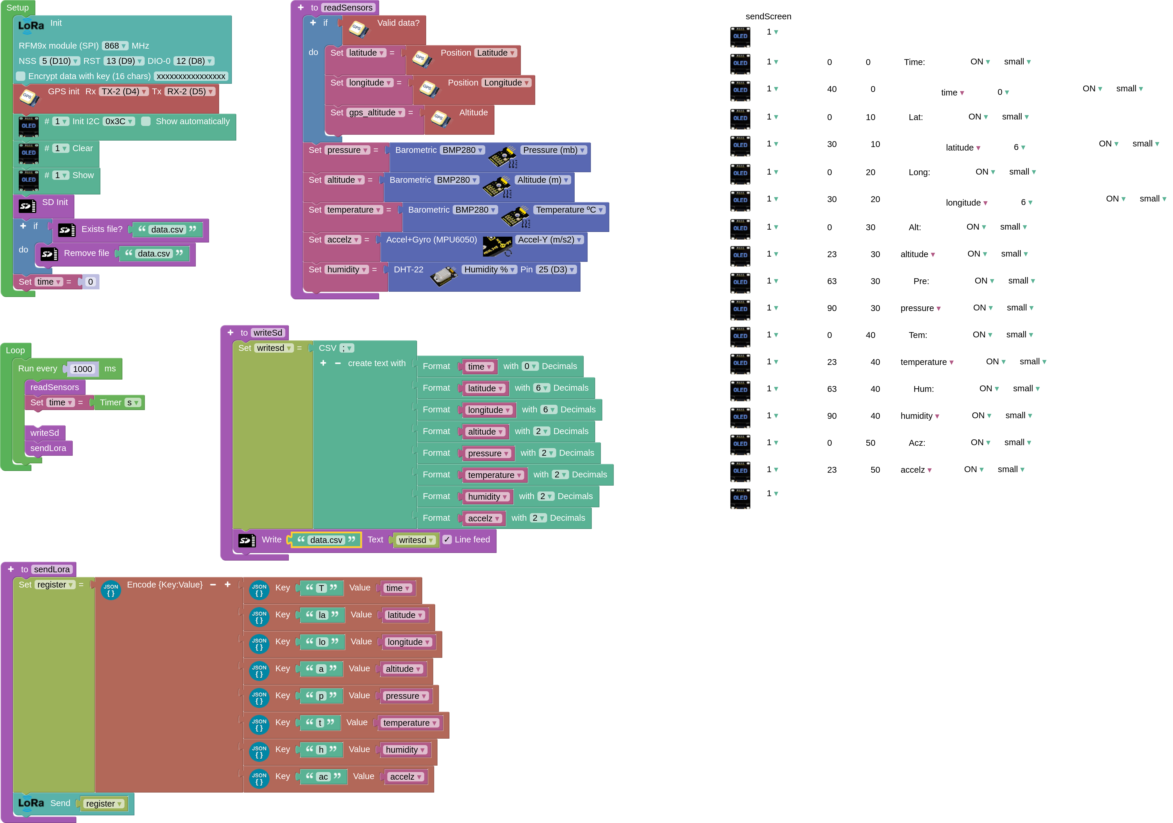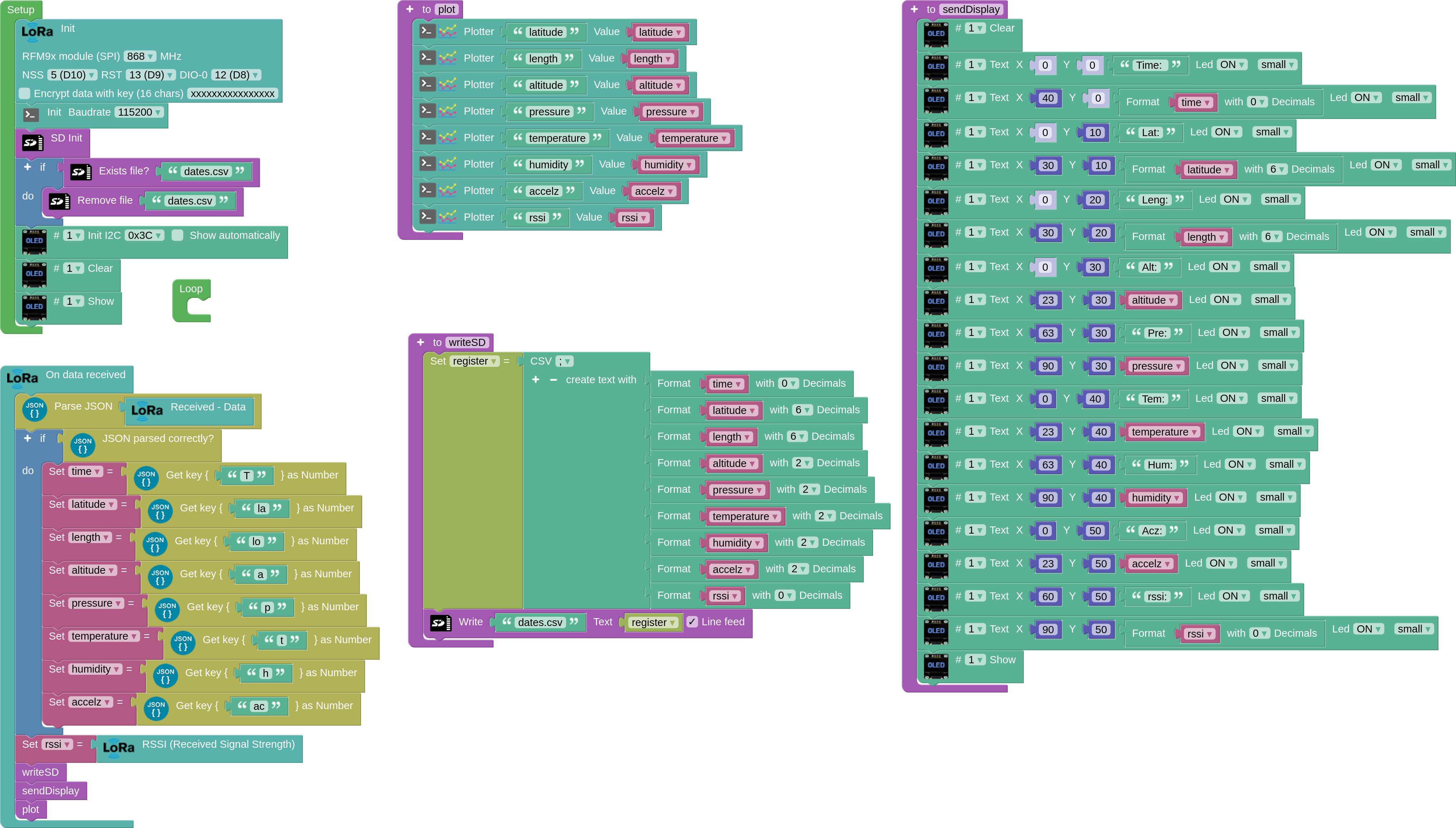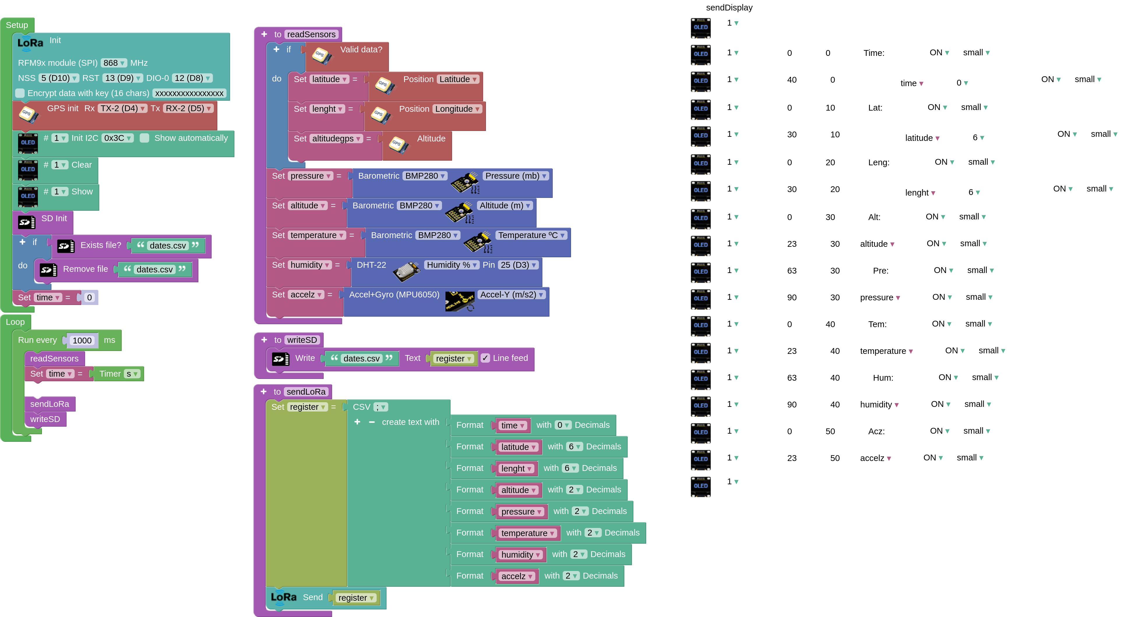 We have a transmitter consisting of an ESP32 STEAMakers with LoRa module, LED display, BMP280 sensor, MPU6050 sensor, DHT22 sensor and GPS. It should collect and send the following data every second: elapsed time, latitude, longitude, altitude (bmp280), pressure, temperature (bmp280), humidity and z-axis acceleration. The receiver, consisting of ESP32 STEAMakers with LoRa module and 0.96' OLED screen, is connected to the PC via USB and performs a serial communication, displaying and plotting in real time on the PC the data received from the Arduino blocks. Both the transmitter and the receiver store the data in CSV format on microSD.