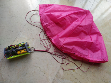 Parachute The parachute is hemispherical in shape. This shape was chosen because the calculation and development of the construction parts are simpler than other solutions. Moreover, the efficiency of the parachute has been demonstrated.